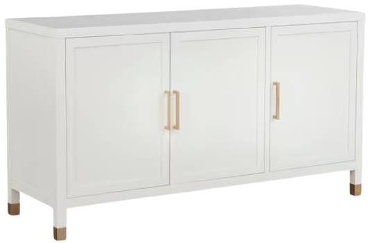 The smooth Hampton White finish, evocative of the glassy surface of coastal waters on a clear day, will brighten your dining space, hallway, or even living room. Satin brass leg ferrules and bar pulls add a sun-on-the-water glimmer to a solid storage option. Stow your treasures or display them there’s ample space for both.