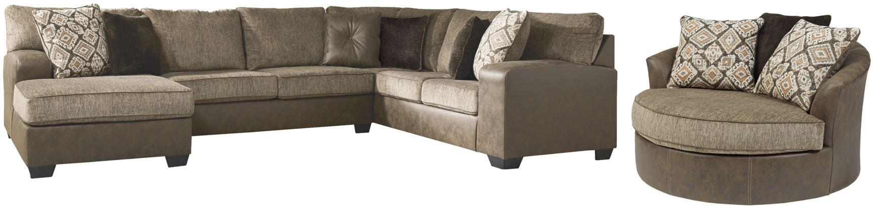 Includes 3-piece sectional (left-arm facing corner chaise, armless loveseat and right-arm facing sofa with corner wedge) and swivel chair