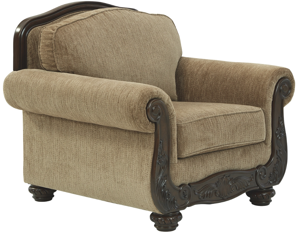 Camelback styling makes a dramatic comeback with this striking chair. Wonderfully ornate, the chair’s exposed rail and arm panels complement classic roll arms sure to strike your fancy. Decadently soft mocha brown upholstery has a chenille feel and richly neutral appeal.