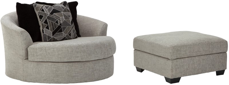 Includes oversized round swivel chair and ottoman with storage