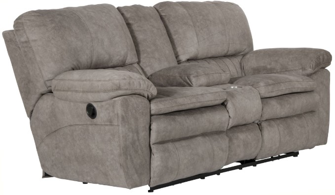 The Reyes Graphite Power Lay Flat Reclining Loveseat with storage & cupholders features a box-bordered pillow top design and contrast luggage stitching. The luxuriously soft printed suede fabric paired with the Comfort Coil Seating featuring Comfor-Gel create an extremely comfortable seat.Read More