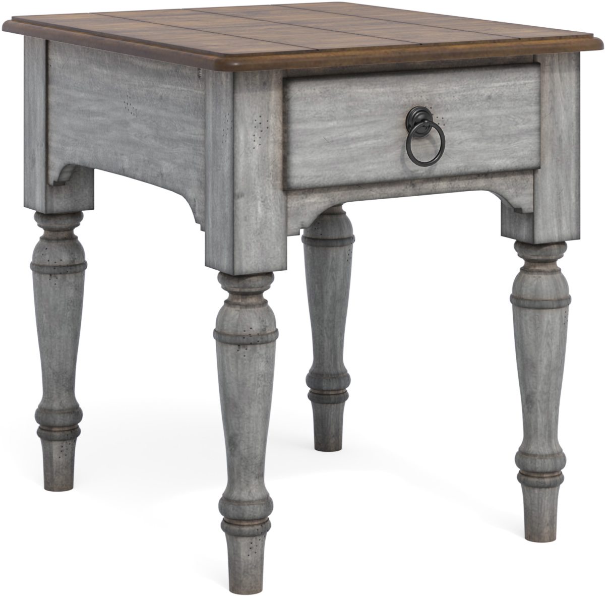 Distressed graywash finish with medium brown top provide a well-worn and cozy aesthetic