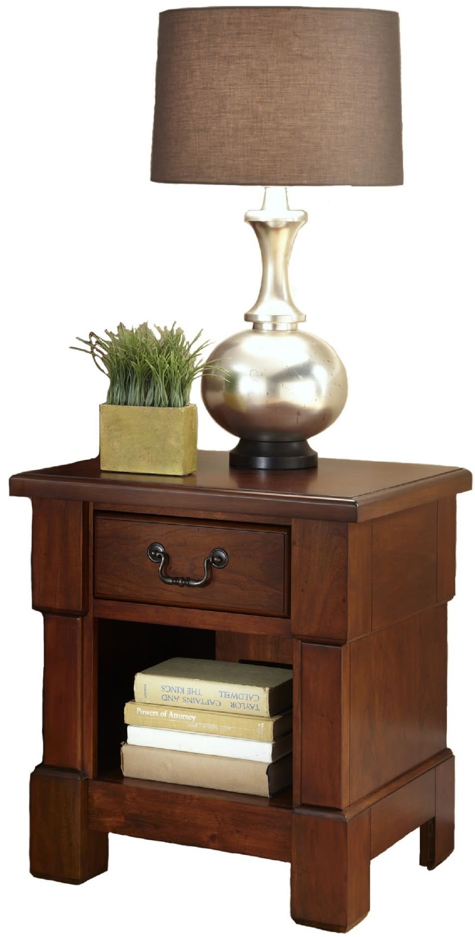 Create ambiance with a perfect balance of warmth and style with the Aspen Nightstand by homestyles. The nightstand is designed with an aged, physically distressed, cherry finish. Beautifully crafted of mahogany solids and cherry veneers, and warmed with a rustic cherry finish. The nightstand encapsulates distinguished Americana style with bold recessed picture frame moldings, rich carved detailed posts, and antiqued brass hardware. There is one drawer with side-mounted easy-glide suspension, and one large open storage area below.