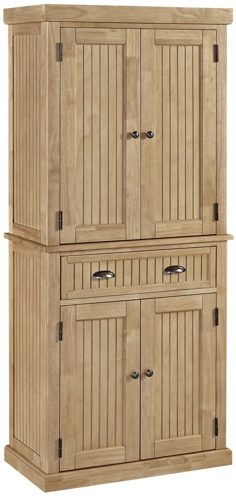 Wainscot flat panels behind solid hardwood frames help define the coastal styling of this Nantucket Pantry by homestyles. Crafted from solid hardwood and veneers with engineered wood, and finished in a natural clear maple finish. The pantry features a single center drawer and both upper and lower doors open to two fully adjustable shelves for flexible storage space. Antiqued brushed nickel hardware completes the coastal feel.