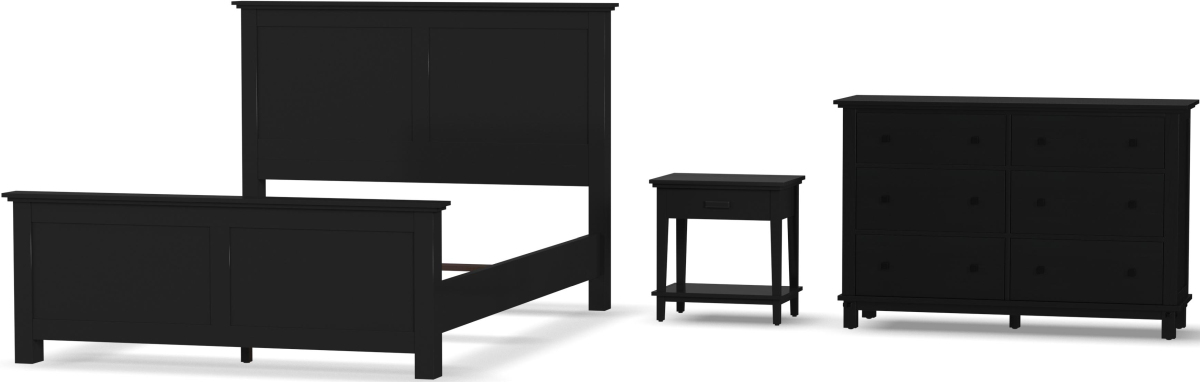 The headboard and footboard feature a timeless double panel design. The nightstand has a single drawer and an open lower storage area. The dresser's top two drawers have a felt-lined bottom in each for delicate items, and four lower drawers provide deep storage for clothing. Painted in a classic black finish, this craftsman-style bedroom set will fit right in with existing furniture, or help you create a new look.