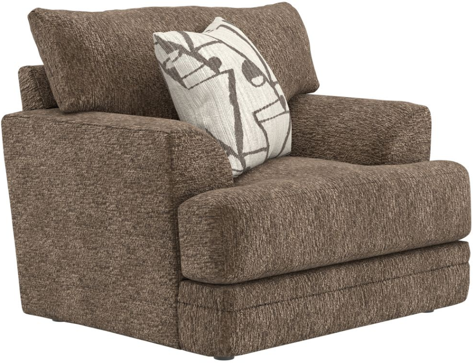 This chair offers a spacious seating area with soft, hazel-colored fabric that feels warm and inviting. Thick seat and back cushions provide support for extended lounging. Included accent pillows add extra comfort. Its sturdy frame and relaxed look make it ideal for everyday use.Read More
