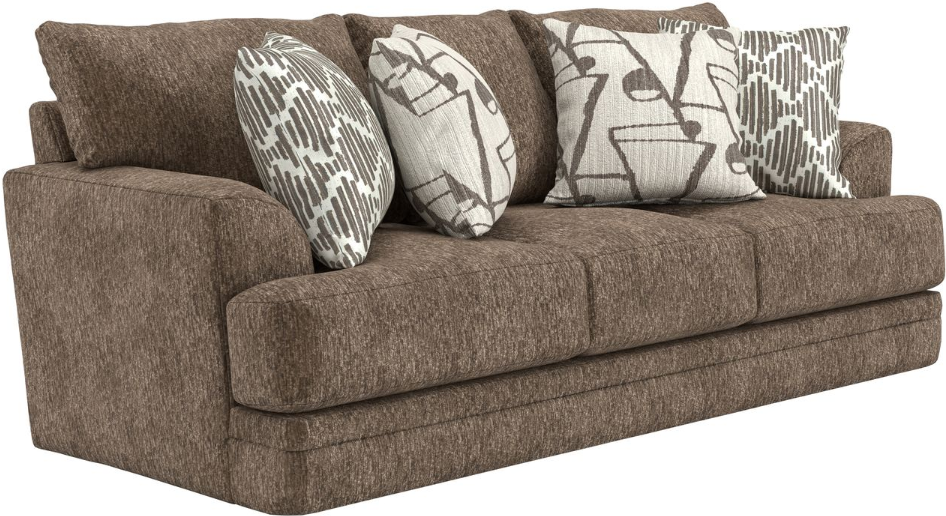 This sofa offers a spacious seating area with soft, hazel-colored fabric that feels warm and inviting. Thick seat and back cushions provide support for extended lounging. Included accent pillows add extra comfort. Its sturdy frame and relaxed look make it ideal for everyday use.Read More