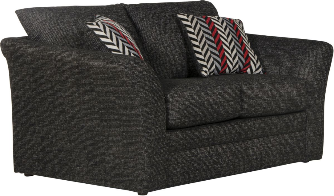 The Varner Ebony Loveseat is a blissful excursion into comfort and relaxation. The warm ebony fabric, flared arms, and chevron-patterned toss pillows in gray and red make the Varner loveseat a stylish and beautiful addition to your living room.Read More