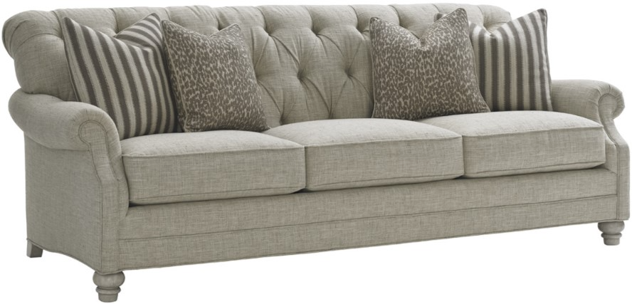 Button tufted designs showcase the craftmanship of a skilled upholsterer while providing a tailored comfort ideal for enjoyment. The three ultra down seat cushions and lux down throw pillows, two 20-inch and two 18-inch, enhance personal contentment. The Millstone finish on the bun feet complement the Oyster case goods finish.Read More