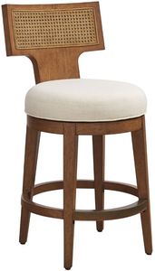 The Calavera swivel counter stool features double-walled woven cane on the backs and upholstered seats. There is a kick plate on the footrests, finished in satin gold. The designs are standard in 2343-11 Sailview, an indoor performance fabric with a linen weave and soft hand. The stools are also available in custom fabrics or leathers.Read More