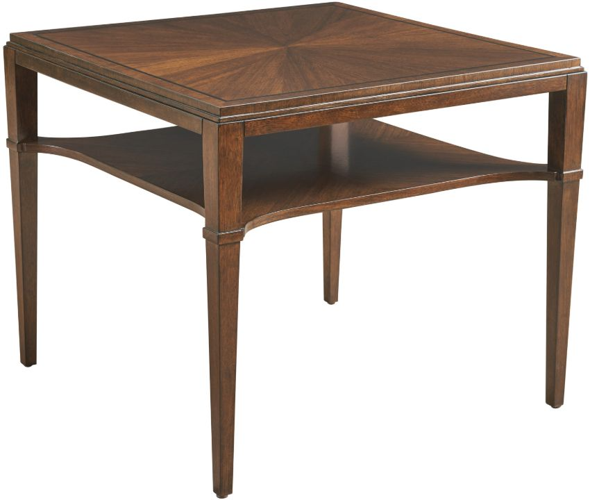 The square Andora lamp table is designed to pair with the cocktail of the same name. The step-down top features a radial matched walnut veneer pattern, an ebony line around the perimeter, a shaped inset wooden shelf, and tapered legs.Read More
