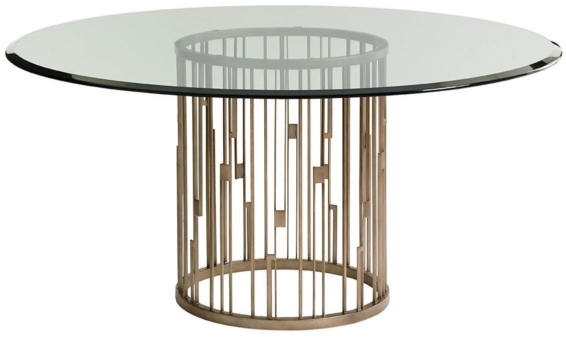 The contemporary fretwork pattern on the hand-forged metal base, finished in burnished silver leaf is inspired by the shadow cast on city landscape as the sun begins to set in the evening, a shadow play. The glass top is three quarter inch thick with polished edges. This seventy-two inch diameter comfortably seats 6.Read More