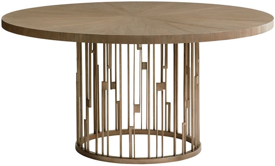 The round dining table features a contemporary base design, which is hand-forged and finished in burnished silver leaf. The 60-inch radial match wooden top showcases the quartered gray elm veneers in the relaxed taupe-gray finish.Read More
