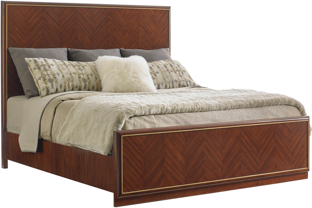 The Lexington Home Take Five Carlyle California King Panel Bed features sturdy wood construction with a herringbone pattern and a sleek gold trim along the raised edges of the headboard and footboard.Read More
