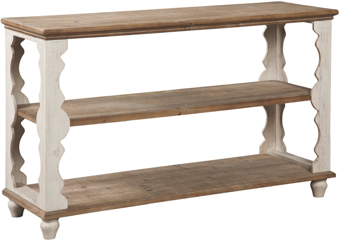 Display books, gadgets, and keepsakes on the 2 spacious shelves of this Alwyndale console/sofa table.