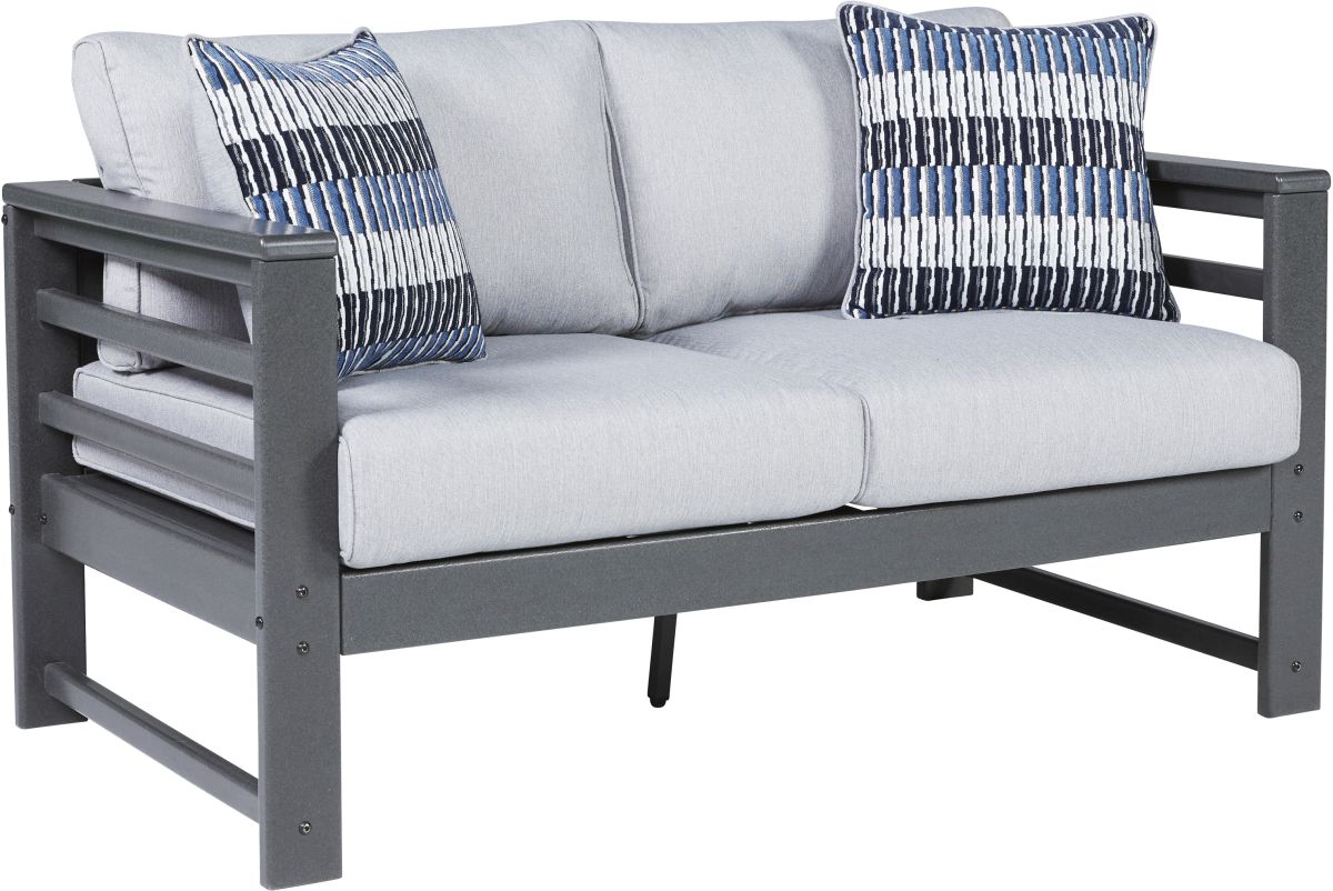 Indulgently comfortable furniture shouldn't be limited to inside spaces. Create your own outdoor oasis with this cushioned loveseat. A study in form and function, the trend-right charcoal gray frame is crafted from MEGA-TUFF® HDPE material for durability and weather resistance. Cushions wrapped in high-performing Nuvella® fabric are comfortable and carefree.Read More
