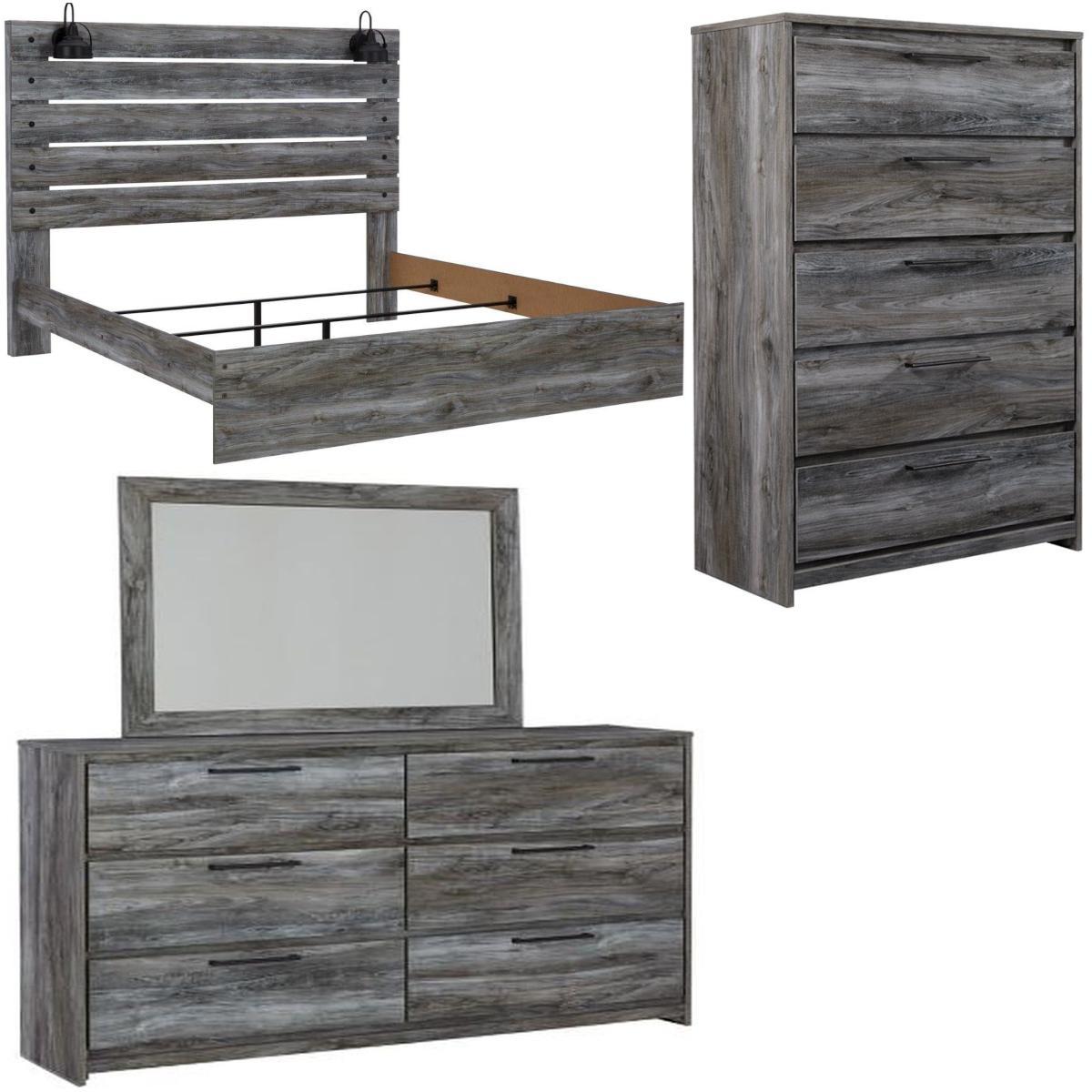 Includes king panel bed (headboard, footboard and rails), dresser with mirror, and chest