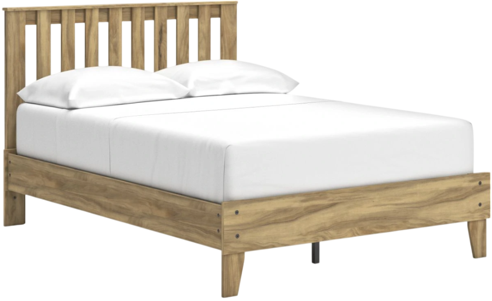 This full platform panel bed puts the dream of a casual bedroom retreat beautifully within budget. Its warm light brown finish over replicated hickory grain exudes a homey vibe. Slatted detailing on the headboard incorporates rich dimension. It’s a simply relaxed way to achieve the bedroom of your dreams.Read More