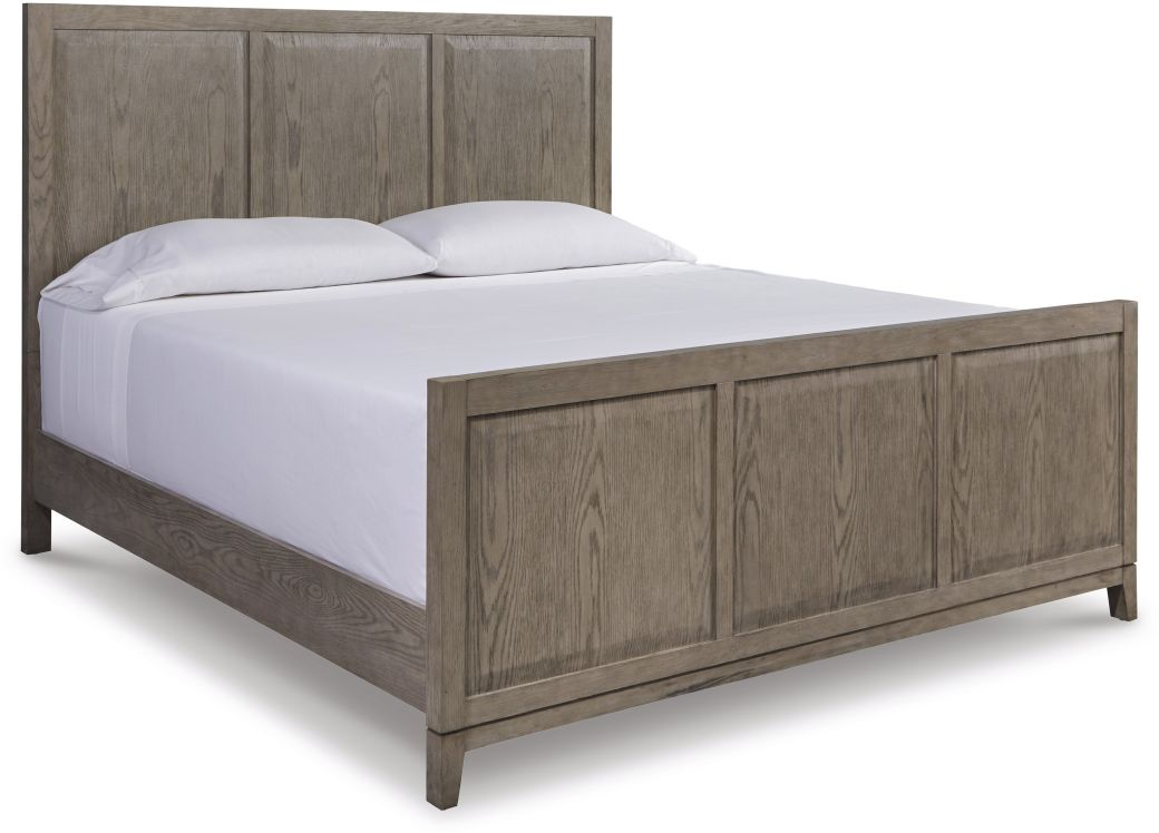 Its headboard and footboard are dressed in a waxy gray finish, while raised panels provide an understated twist to the streamlined design.