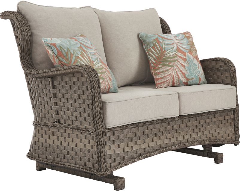 Clearly for those with exceptionally good taste, this outdoor loveseat glider revisits the past, but with today’s low-maintenance approach in mind. Modeled after classic “front porch” wicker furniture, this high-style two-seater includes a rust-free aluminum frame beautified with an all-weather resin weave for authentic flair—but with easy care! Covered in high-performing Nuvella® fabric, the loveseat’s plush cushions and throw pillows are sure to sit well with you, too.