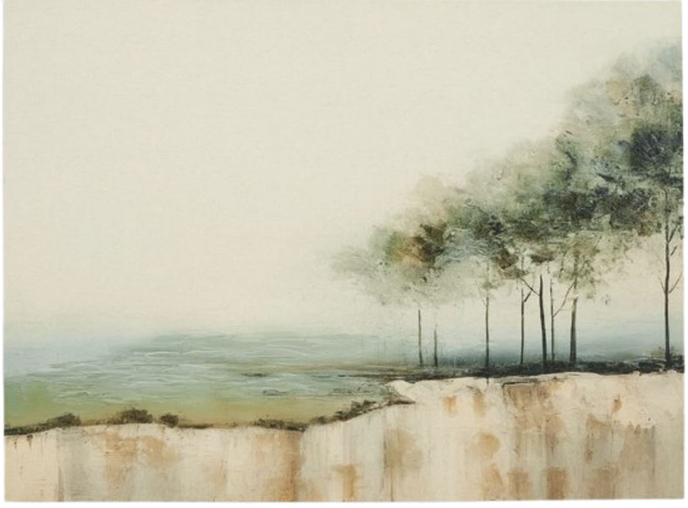 Take in the tranquil ambiance of this wall art. A muted background, in calming shades of beige, green, black and blue, gives the impression of fog rolling in. Beautifully finished with hand-painted embellishments, this peaceful landscape gives your decor a simply serene upgrade.Read More