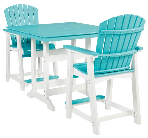 Raise the bar on outdoor living with this dining set. Crafted for style and durability, the counter height bar stools and table feature a slatted design that easily sheds rainwater, and a two-tone look that pairs a light turquoise and white for twice the interest. The table's umbrella hole lets you throw some shade on your outdoor living space.Read More