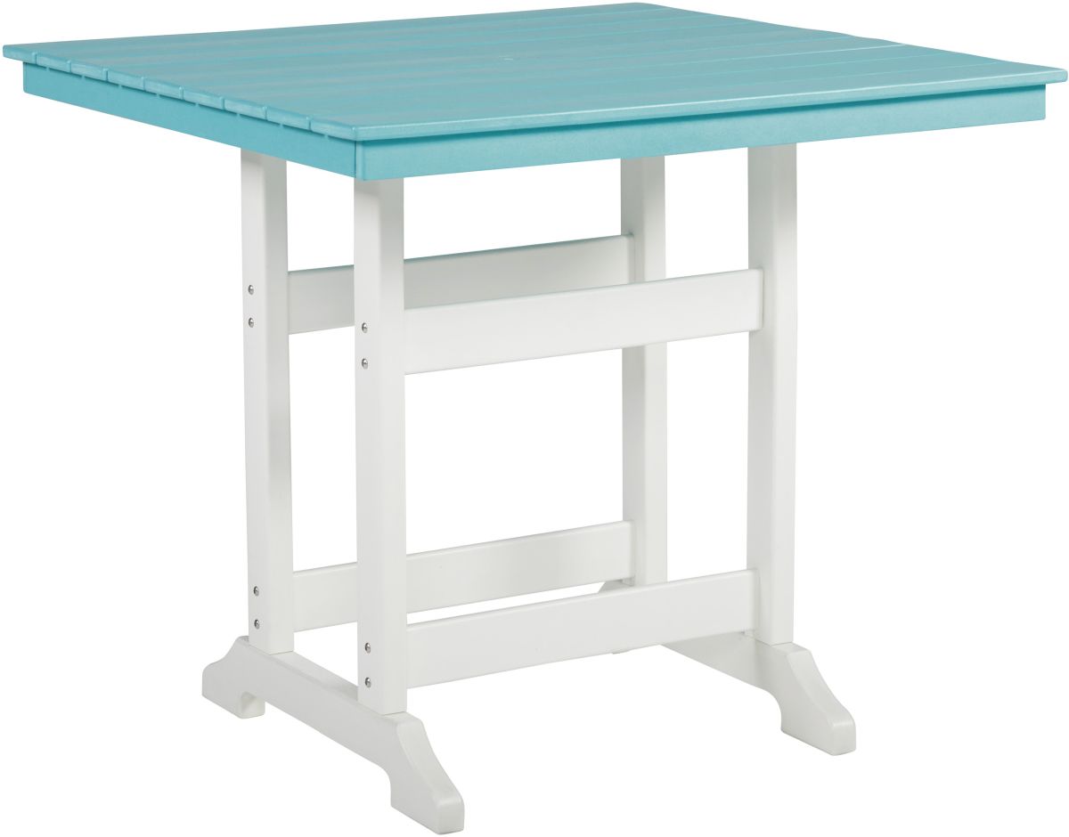 Raise the bar on outdoor living with this dining table. Crafted for style and durability, it caters with a standout two-tone look that pairs a light turquoise and white for twice the interest. The table's counter height design elevates the aesthetic. An Umbrella hole lets you throw some shade on your outdoor living space.Read More