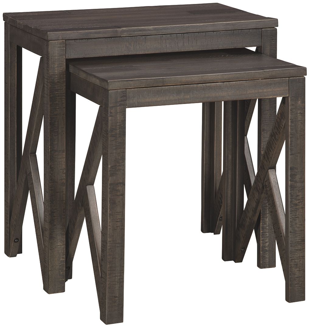 Whether displaying décor or making space in the living room, the Emerdale 2-piece nesting table set leaves the creativity up to you. The offset plank-style tabletops and asymmetrical cross-buck base add vintage style updated in clean, contemporary lines.