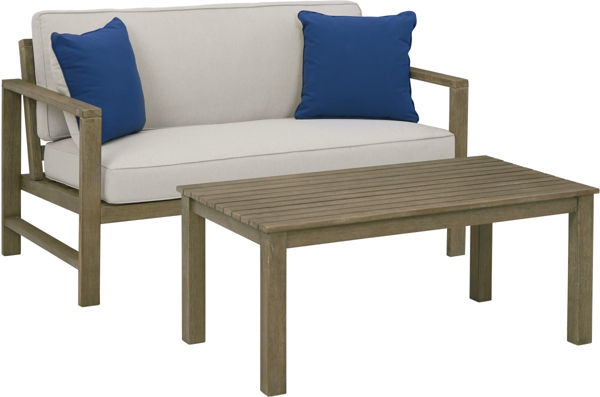 With its sleek lines, gorgeous driftwood tone and cushioned comfort, this 2-piece outdoor loveseat with table set can make your outdoor space feel more like an upscale resort. Made for looks and longevity, this high-quality ensemble is built from eucalyptus wood treated to a deluxe embossed finish to brave the elements. The thick, all-weather seat cushion and back pillow are wrapped in a delightfully neutral Nuvella® fabric that’s a breeze to clean. Pair of throw pillows add a coastal cool touch.