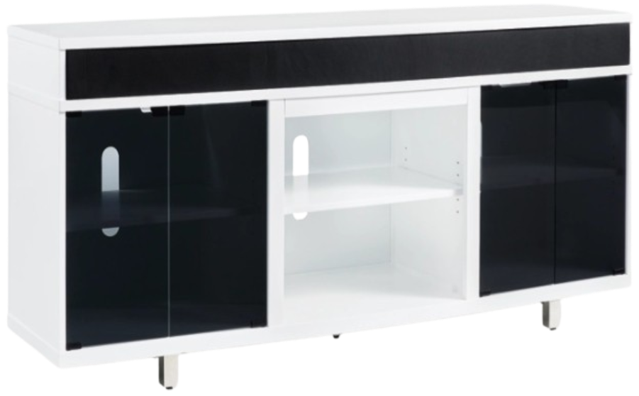 Combining a white high-gloss finish with black glass doors, this TV stand proves opposites really do attract. It's the perfect blend of modern style and functionality, with an electric fireplace option and ample space for your media devices, flat-screen TV and soundbar. What a smart choice on so many levels.Read More