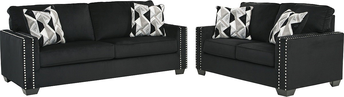 Raise your standard of living with this sofa and loveseat package, designed for high-glam home decor. Dressed to impress, each piece features 2-over-2 cushion styling and sleek track arms punctuated with nailhead trim. The clean-lined profile is easy on the eyes and alluring to the touch with low-pile soft velvet that is hard to resist. Its posh appeal is enhanced by abstract patterned throw pillows.Read More