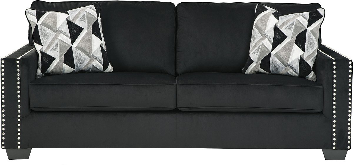 Raise your standard of living with this oveseat in onyx black. Reserved exclusively for those with a penchant for high-glam home decor, this ultra-chic loveseat is dressed to impress with a clean-lined profile, 2-over-2 cushion styling and sleek track arms punctuated with nailhead trim. Easy on the eyes and alluring to the touch, this decidedly contemporary loveseat is covered in a low-pile soft velvet that’s impossible to resist. Abstract-patterned throw pillows enhance the posh appeal.