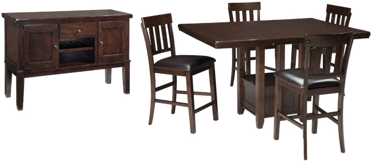 Take clean-lined, classic styling. Add modern comfort. Top with a deep, complex finish that exudes rich sophistication. That’s the look and feel of this counter height dining table set with extension leaf to accommodate guests. Faux leather upholstered seating and a versatile server make it complete.Read More