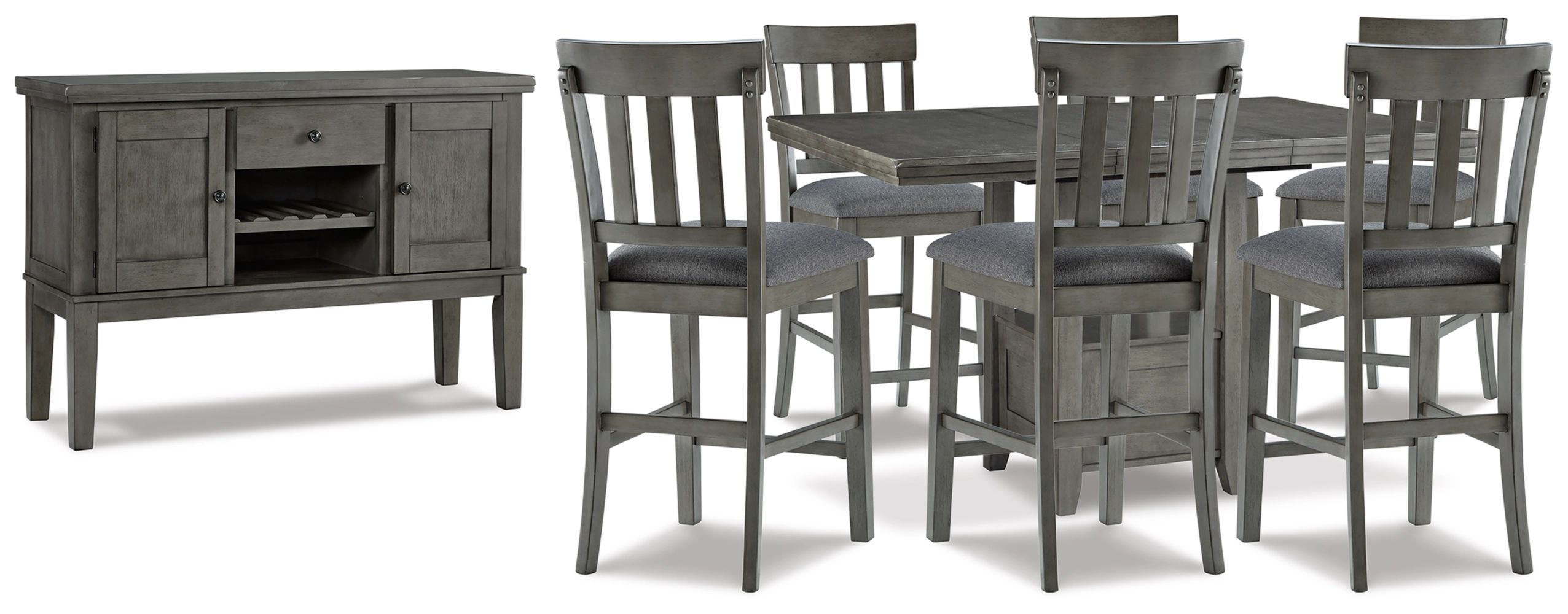 Cool and on-trend. This set features a counter height extension table sports, Upholstered Bar stools, and dining room server. All pieces have an antiqued gray color for a contemporary-yet-casual feel. Dining with friends and family has never been so stylish.Read More