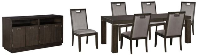 Includes extension dining table, server and 6 upholstered chairs