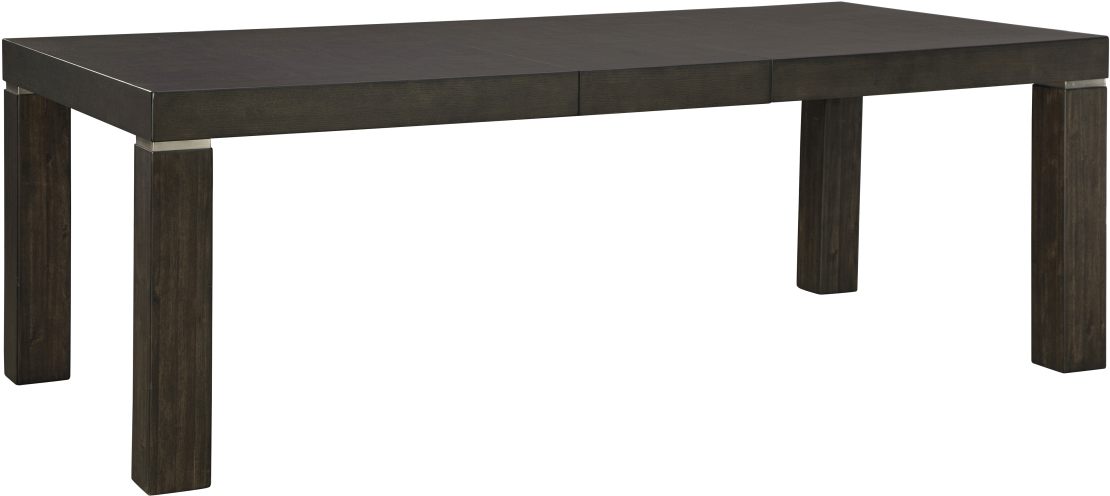 This Hyndell dining table comes in a rich, espresso-brown finish with dining space for up to 8 thanks to the extension leaf. Stylish, nickel-tone bands at the top of the legs finish off this handsome table.