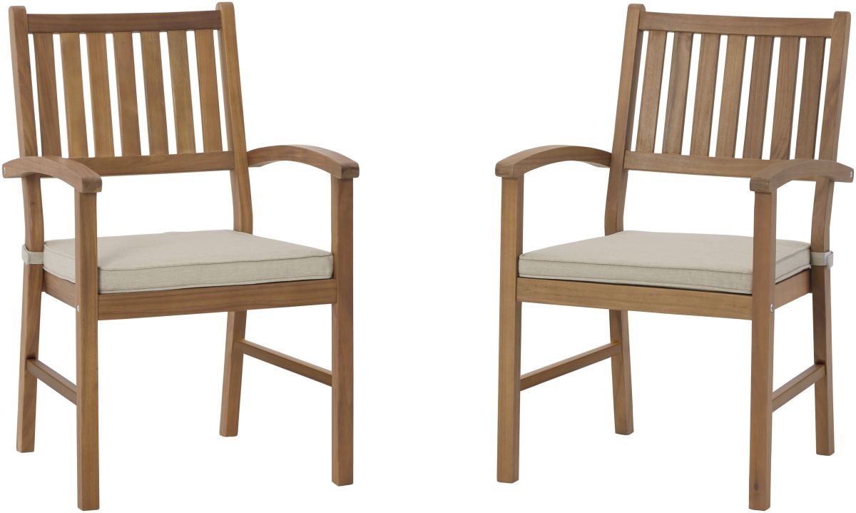 There's no need to be stuck inside when the weather is perfect. Enjoy an alfresco gathering with this outdoor arm chair and cushion set. Made of solid acacia wood, this chair set is built to keep its looks with a slatted seat that sheds rainwater and weather-friendly cushions covered in Nuvella® high-performance fabric. You'll love soaking in the scenery from here.Read More