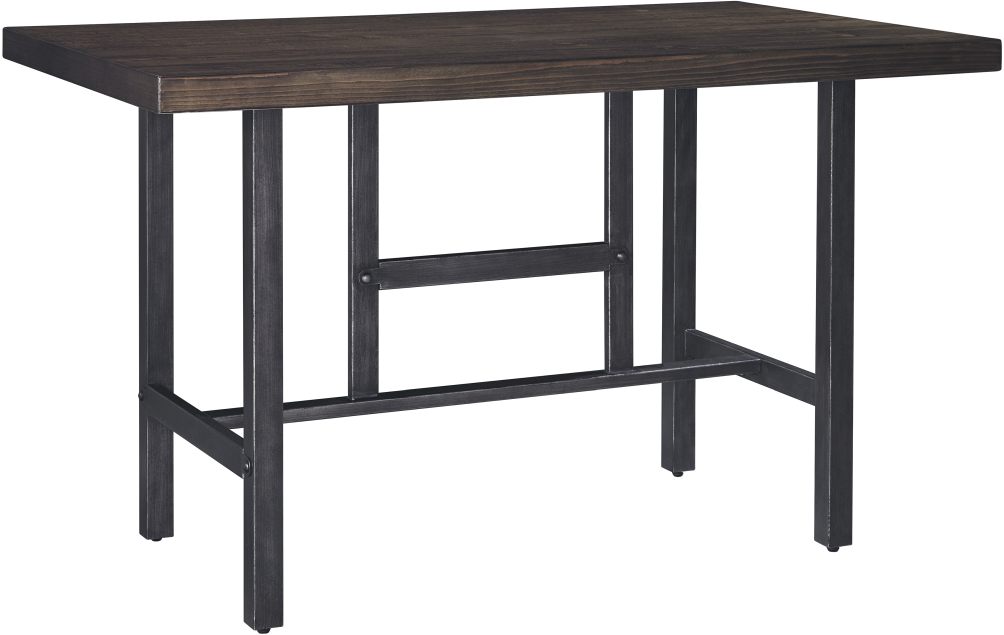 The Kavara dining room counter table is built with a metallic trestle base and a stark saw-kerf tabletop.