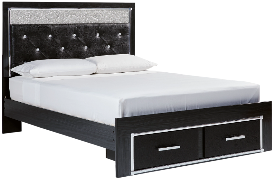 Padded windowpane stitching on the sleek, black upholstery infuses a sumptuous look that’s upscale and indulgent, and utterly on trend. Double drawers at the foot of the bed provide space-saving storage.