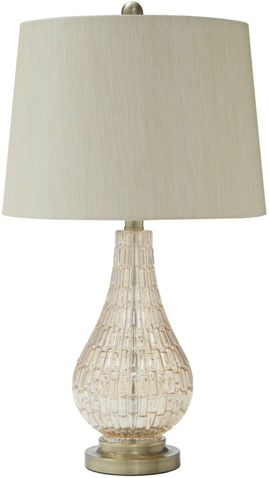 Let this table lamp feed your design appetite. The curvy silhouette permeates your room with contemporary romance, while the champagne-hued glass body is a soft and feminine finish. A brass-tone base finesses the look with a sleek touch.Read More