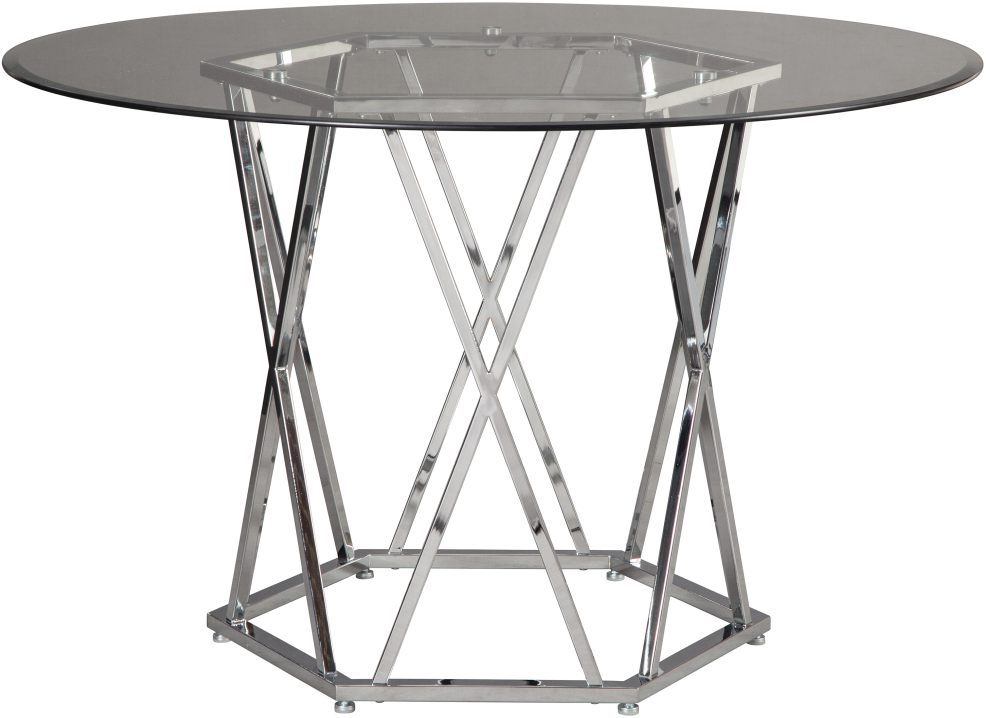 Set intimate dinners on the beveled edge, glass top of the Madanere dining table. The hexagonal base and chrome-tone finish add a strikingly unique edge to your style.