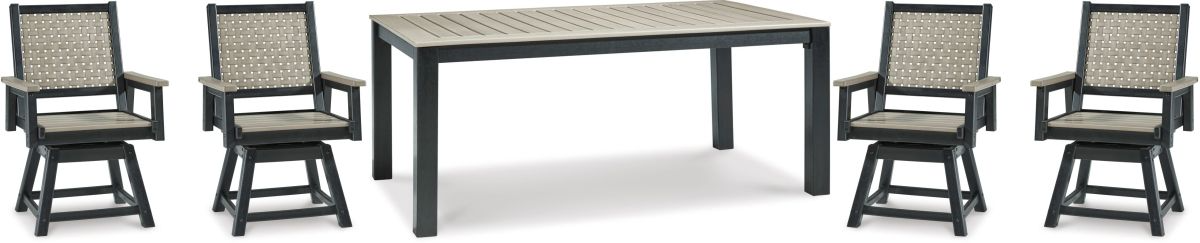 On-trend stylings take to the outdoors with this dining package. Its two-tone look in driftwood and black has a laid-back luxe appeal. High design meets durability with this outdoor set’s weather-resistant HDPE construction—a stunning display of form and function.Read More