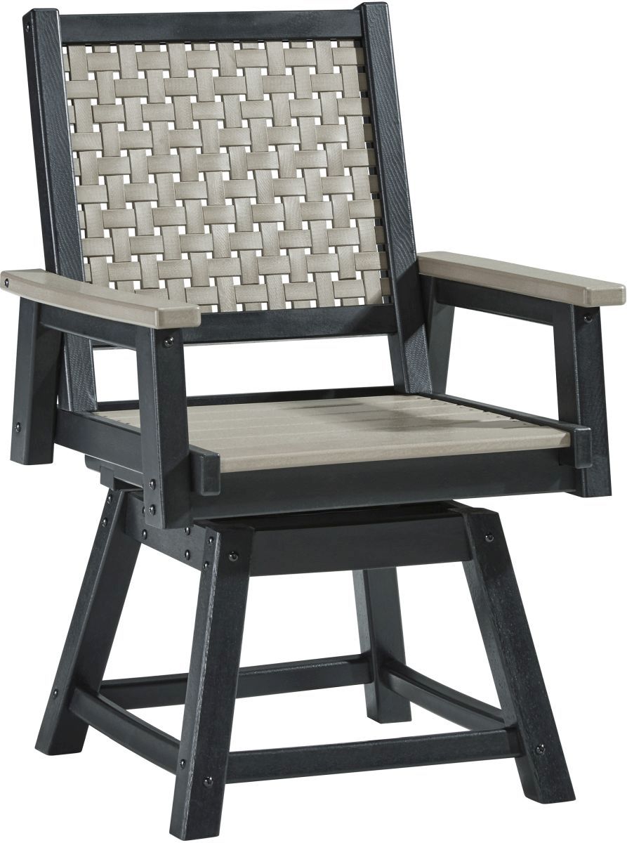 On-trend stylings take to the outdoors with this swivel dining chair. Its two-tone look in driftwood and black has a laid-back luxe appeal. High design meets durability with this outdoor chair's weather-resistant HDPE construction—a stunning display of form and function.Read More