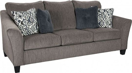 The Nemoli slate-colored sofa features loose cushions, unattached backs, 2 patterned accent pillows, and 2 button tufted pillows for a rounded out look.