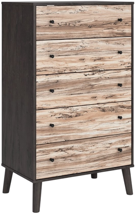 The perfect marriage of simple and contemporary style, this chest of drawers is a charming addition to your home. It features an expressive two-tone look, with dark charcoal finish over replicated oak grain with an authentic touch and a replicated sugarberry wood grain. Ball-bearing glides offer smooth opening and closing of the drawers.Read More