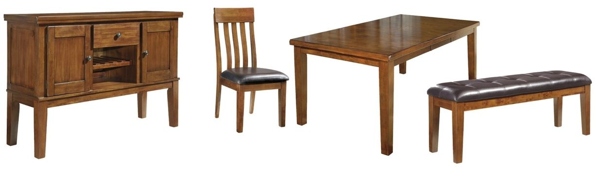 Includes extension dining table, upholstered bench, 4 upholstered rake-back chairs and server