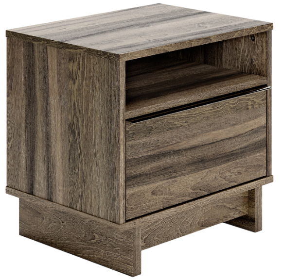 Your modern sanctuary is within reach. The subtle design of this nightstand is accented with a low profile base. Its weathered brown finish is complemented with refined champagne-colored handles on the smooth-gliding drawers. An open shelf provides additional bedside storage.Read More