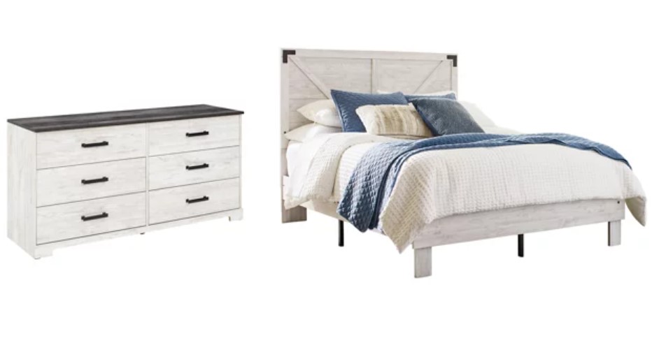 Includes panel platform bed (headboard and platform bed) and 6-drawer dresser