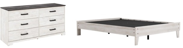 Includes queen platform bed (does not include headboard) and 6-drawer dresser