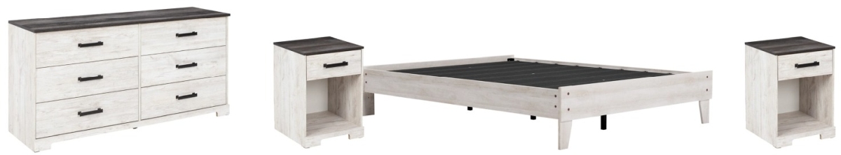 Includes queen platform bed (does not include headboard), 6-drawer dresser and two 1-drawer nightstands